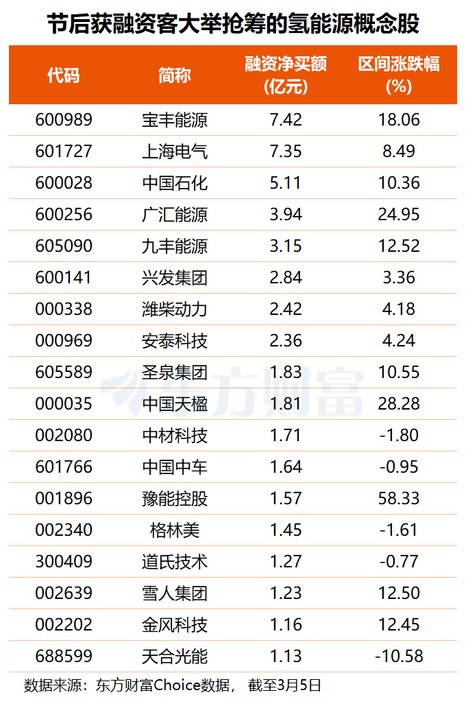 从资金角度看,东方财富Choice数据显示,节后以来,共有122只氢能源概念股获得融资净买入,其中净买额超1亿元的多达18股。