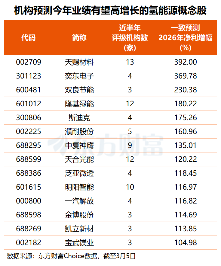 未来增长潜力方面,根据3家及以上机构一致预测,天赐材料、奕东电子今年净利有望同比增逾3倍,双良节能预测净利增幅达230.38%,隆基绿能、濮耐股份、明阳智能、天合光能等11只氢能源概念股今年业绩也有望实现翻倍增长。