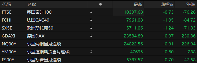 周五盘前,美股三大股指期货齐跌,欧洲主要指数普遍下跌。截至发稿,纳斯达克100指数期货跌0.91%,道指期货跌0.60%,标普500指数期货跌0.70%。