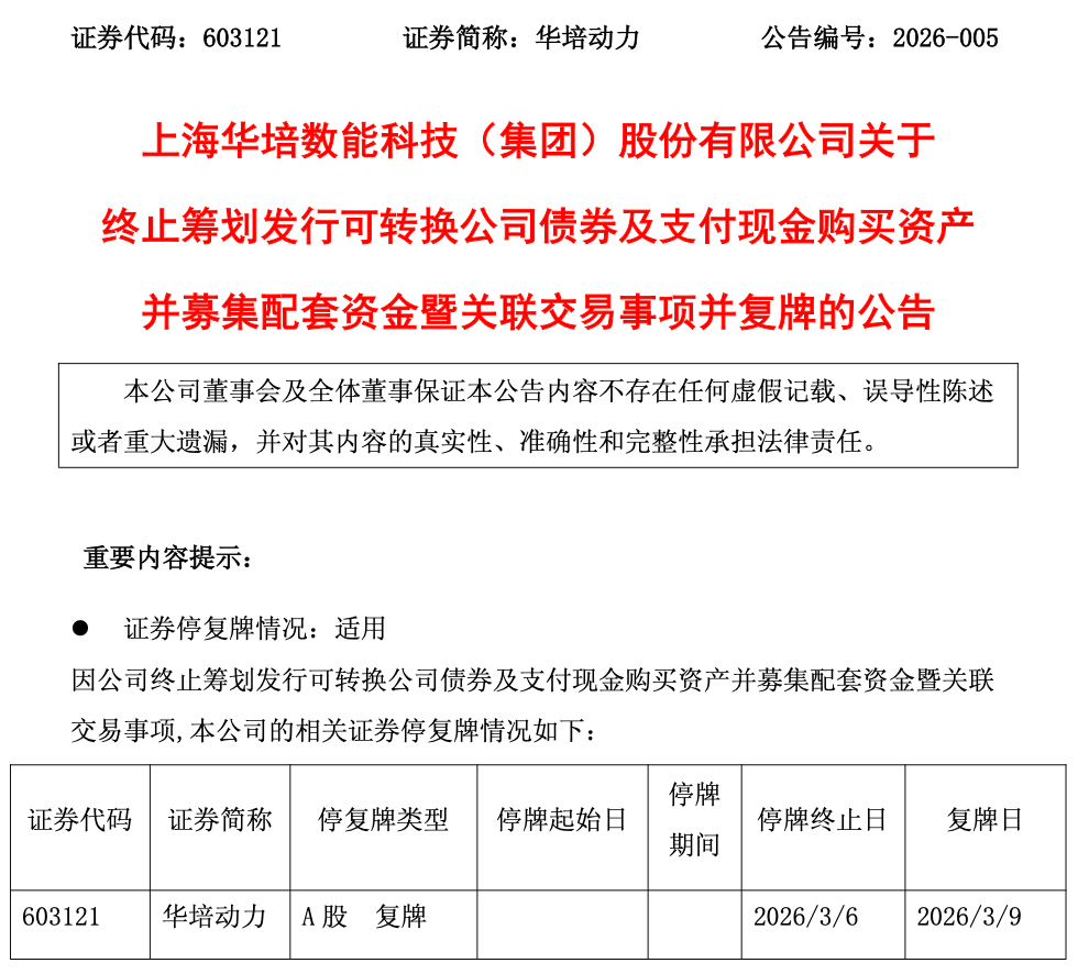 3月6日,华培动力(603121)发布公告,公司因筹划通过发行可转换公司债券及支付现金方式购买无锡晟熠产业投资合伙企业(有限合伙)(以下简称“无锡晟熠”)持有的美创智感(无锡)汽车零部件有限公司100%股权,并向不超过35名特定投资者发行股份募集配套资金,公司A股股票自2026年2月13日(星期五)开市起停牌。经审慎研究,公司决定终止筹划本次交易事项,公司股票自2026年3月9日(星期一)开市起复牌。