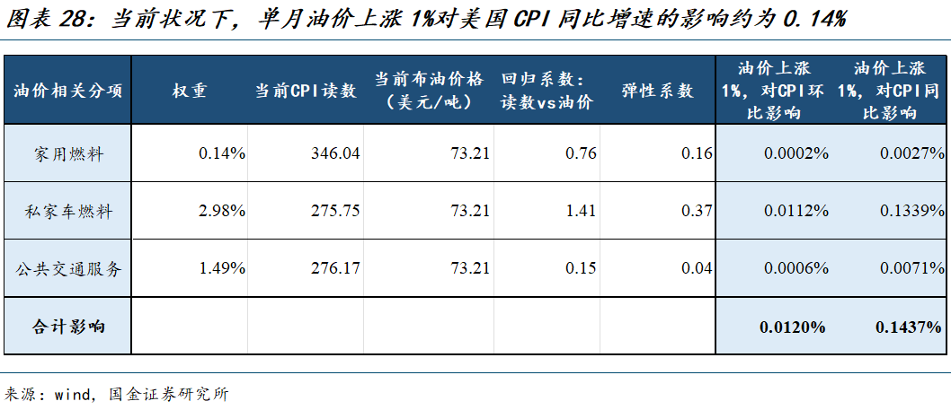 经过测算,我们认为单月油价上涨1%对美国CPI同比增速的边际影响约为0.14%。考虑到2026年1月美国CPI同比增速边际下降0.3%,假设未来每个月油价的上涨能够产生对CPI的边际向上拉动作用能达到0.3%,那么单月油价的涨幅要在2%左右。结合当前布伦特原油73.2美元/桶的价格来看,这意味着如果年末油价升至90美元/桶附近,美国CPI同比增速才会转为上行。