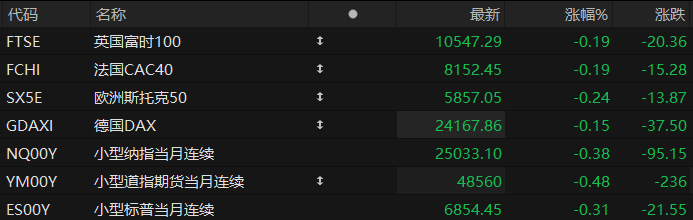周四盘前,美股三大股指期货齐跌,欧洲主要指数普遍下跌。截至发稿,纳斯达克100指数期货跌0.38%,道指期货跌0.48%,标普500指数期货跌0.31%。