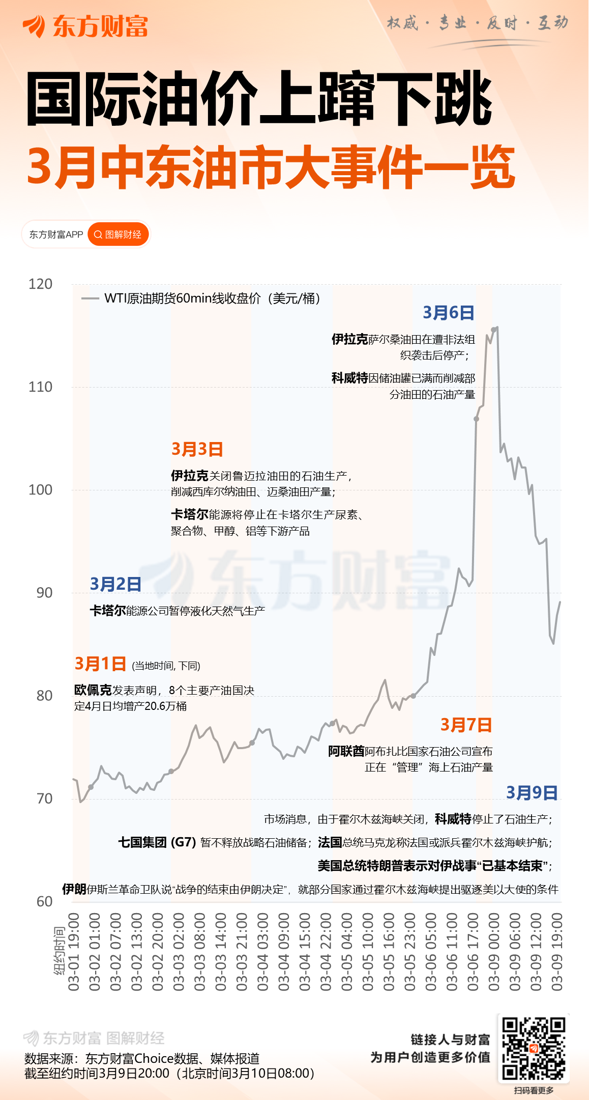 当天,国际油价坐上了刺激的“过山车”。周一亚盘时段,布伦特原油一度暴涨30%,至约120美元/桶。后因美国总统特朗普称战争可能很快就会结束,国际油价暴跌,作为全球油价基准的布伦特原油期货价格一度跌9%,至约84美元/桶。截止发稿,已回升至93美元附近。