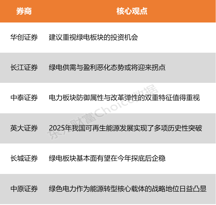 华创证券表示,绿电下游新需求、新赛道不断涌现,21年绿电行业见顶后当前板块估值处在历史的相对底部,建议重视绿电板块的投资机会。长江证券指出,2026年用电增速有望回升至5.04%,叠加AI数据中心、工业电气化等新增负荷,绿电供需与盈利恶化态势或将迎来拐点。
