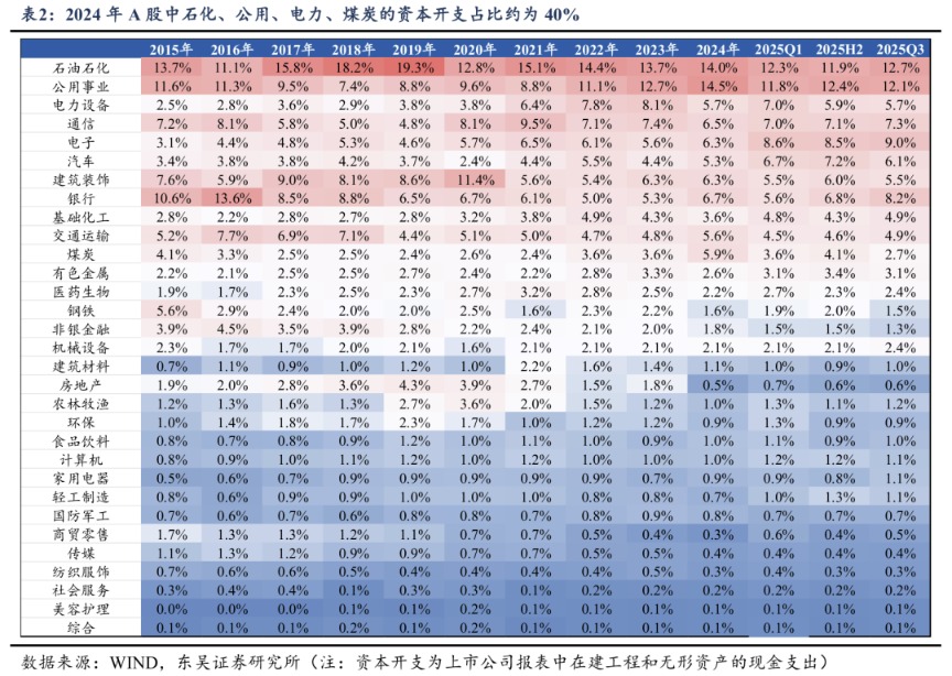 能源安全+AI缺电,加速能源建设。2022年俄乌冲突后导致全球能源成本的提高,尤其加剧了欧洲国家能源成本压力。为了能源安全的长期考虑,各国均加大对于能源项的资本开支。美国在2022-2023年提高电力的投资,其增速为2008年次贷危机以来的最高值;中国同样在2022-2024年增加对于泛能源板块的资本开支,从上市公司角度,石化、电力、公用、煤炭的2024年资本开支占比合计约40%。另一方面,AI的快速迭代,加速了电力的消耗。根据IEA《能源与人工智能》提到,全球数据中心的用电量预计将翻倍,到2030年达到约945太瓦时,约占2030年全球总用电量的3%。从2024年到2030年,数据中心用电量每年增长约15%,是其他所有行业总用电量增长的四倍多。