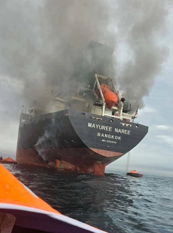 这张泰国海军3月11日发布的照片显示,一艘泰国货船在霍尔木兹海峡海域遭袭起火。图片来源:新华社