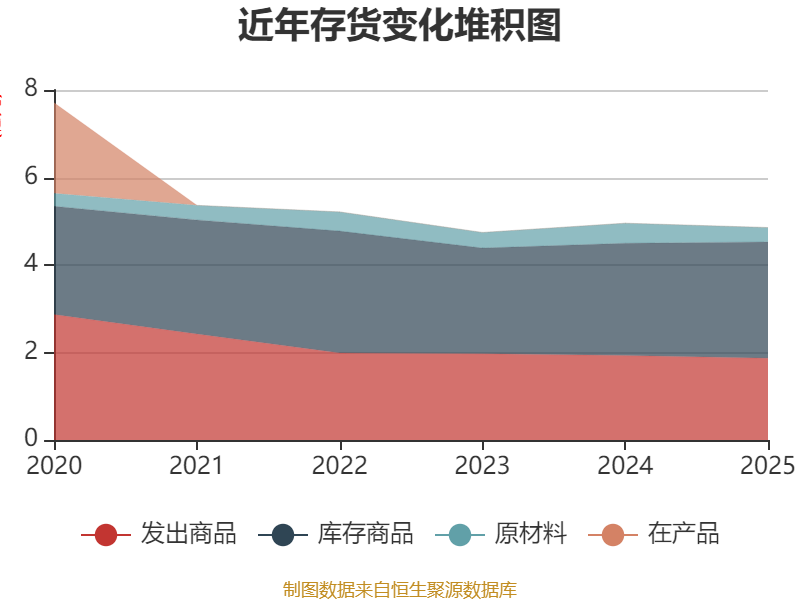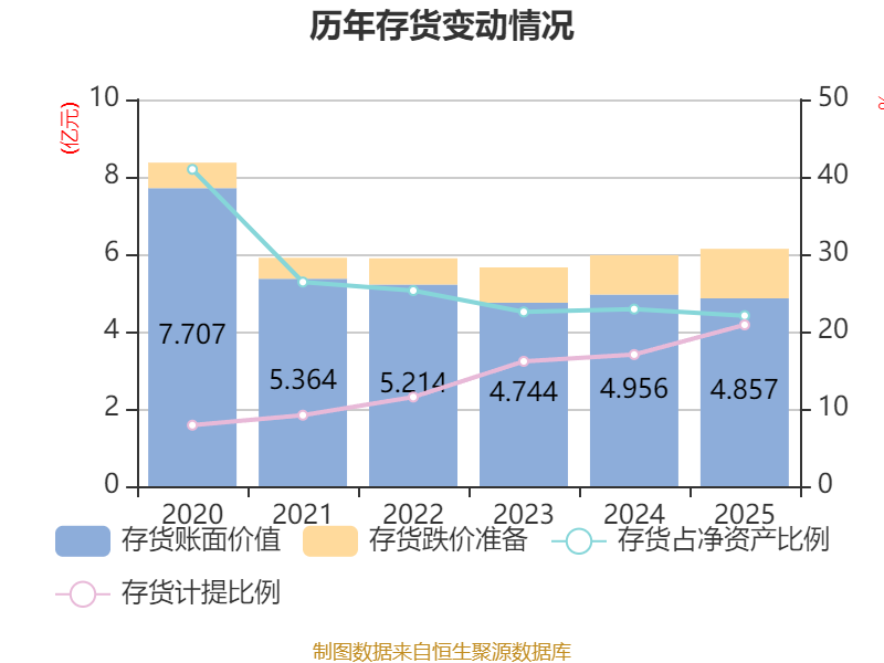 从存货变动来看,截至2025年末,公司存货账面价值为4.86亿元,占净资产的22.05%,较上年末减少982.26万元。其中,存货跌价准备为1.28亿元,计提比例为20.86%。