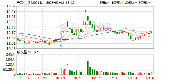 股价表现方面,截至3月16日收盘,沃森生物报12.28元/股,总市值约196.40亿元。