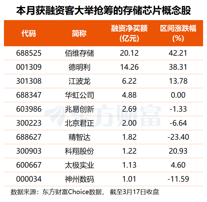 从资金角度看,东方财富Choice数据显示,3月以来,共有28只存储芯片概念股获得融资客超千万元抢筹,其中,佰维存储融资净买额高达20.12亿元,德明利获杠杆资金加仓14.26亿元,江波龙也获融资客大举抢筹6.22亿元,华虹公司、兆易创新、北京君正融资净买额均在2亿至5亿元之间。