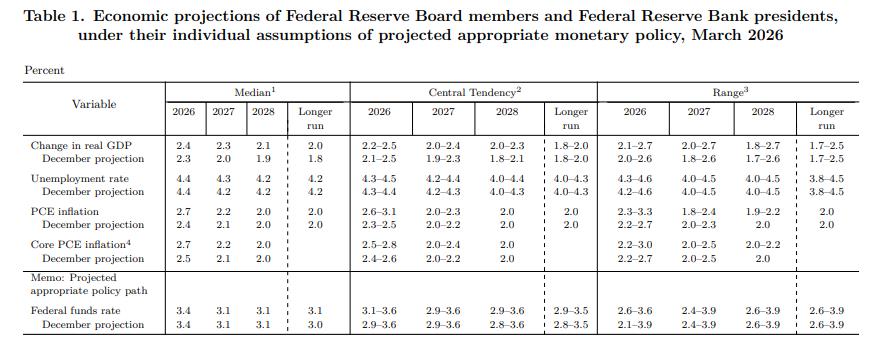 就业市场相对保持韧性。美联储预计今年失业率4.4%,与上次预测持平,2027年上修0.1个百分点至4.3%,长期失业率维持在4.2%。