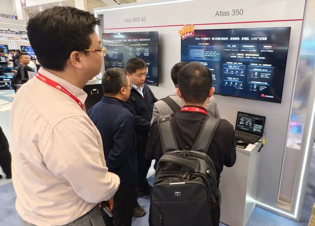 展台工作人员告诉记者,Atlas 350除了支持FP16、FP8外,还支持更低精度的FP4。这意味着,集成Atlas 350板块的服务器能够支持更大的模型以及时延更低的推理,精度小了,计算速度就会更快,寄存器效率也会更高。目前Atlas 350在互联网推荐场景的实测数据显示,该卡的时延更低、响应更快,特别适合短视频、电商、广告推荐等高并发场景。在大模型推理、文生图、文生视频等多模态场景,其性能也和英伟达的L20相当。