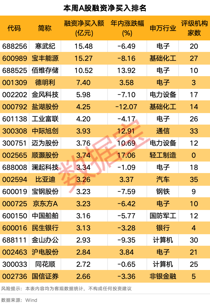个股方面,本周80股融资净买入额在1亿元以上,寒武纪、宝丰能源、佰维存储净买入额均超过10亿元,其中寒武纪最高,为15.48亿元。