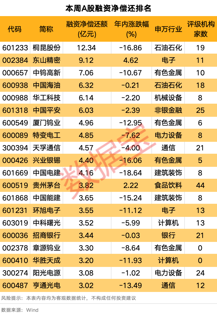 95股融资净偿还额超过1亿元。桐昆股份、东山精密、中钨高新排名前三,融资净偿还额依次为12.34亿元、9.12亿元、7.06亿元;中国海油、华工科技、中国平安紧随其后,净偿还额均在6亿元以上。