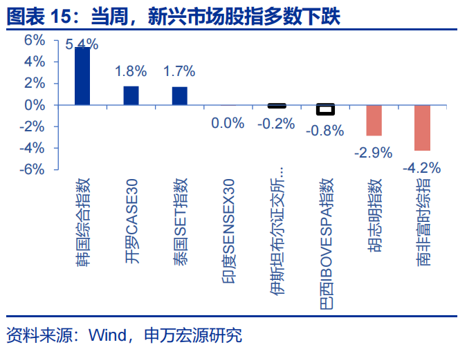 当周,发达市场股指悉数下跌、新兴市场股指多数下跌。发达市场股指方面,德国DAX、英国富时100、法国CAC40分别下跌4.6%、3.3%、3.1%;新兴市场股指方面,南非富时综指、胡志明指数、巴西BOVESPA指数分别下跌4.2%、2.9%、0.8%。