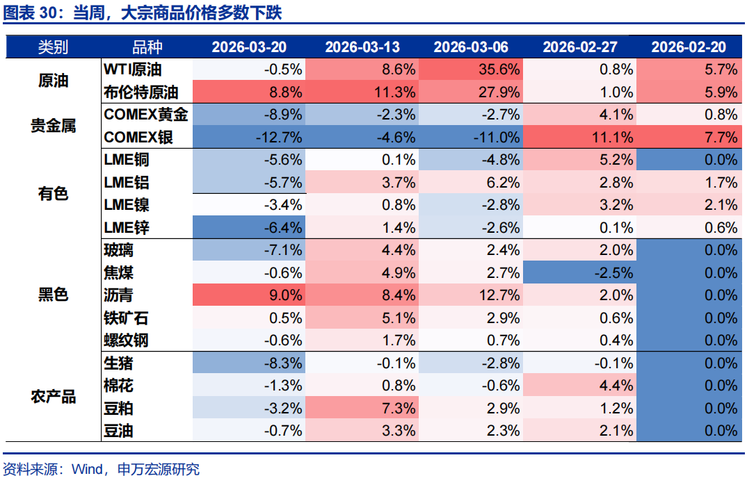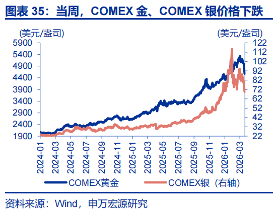 当周,有色金属价格悉数下跌、贵金属价格悉数下跌。LME铝下跌5.7%至3287美元/吨,LME铜下跌5.6%至12128美元/吨;通胀预期上行2bp至2.38%;COMEX银价格下跌12.7%至69.5美元/盎司,COMEX金价格下跌8.9%至4576.3美元/盎司;10Y美债实际收益率上行9bp至2.01%。