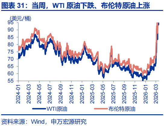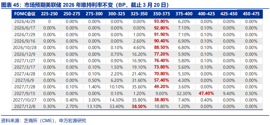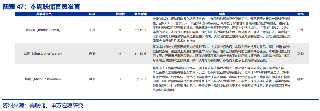 本周美联储召开3月FOMC例会,维持利率不变,但会议基调偏鹰,叠加油价前景不确定性较强,市场对美联储降息预期快速下修。根据芝商所数据,市场已不再预期美联储将在2026年降息。短期内,美联储关注核心为通胀,但部分联储官员(沃勒)讲话仍为年内降息留出空间。