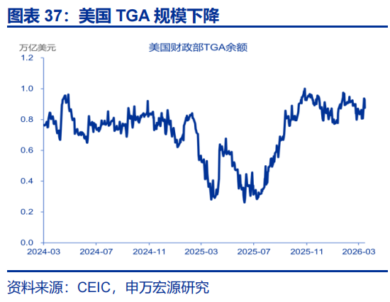截至2026年3月18日,美国TGA余额降至8758亿美元,较2026年2月中明显下降;本周(2026年3月16日-2026年3月18日),美债净发行规模低于上周,其中短期国债出现多日较高规模赎回;而美债15日滚动净发行额最新升至145.72亿美元。