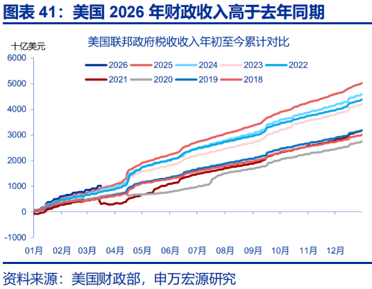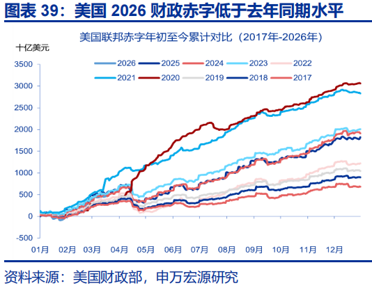 截至2026年3月17日,美国2026日历年累计财政赤字规模4629亿美元,去年同期为5120亿美元;累计支出规模18423亿美元,去年同期17661亿美元;累计财政税收收入10164亿美元,去年同期9310亿美元;关税收入规模630亿美元,去年同期196亿美元。
