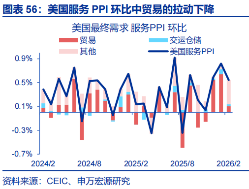 美国2月PPI同比3.4%,环比0.7%,市场预期环比为0.3%,前值0.5%。从环比驱动结构来看,2月PPI环比提升的主要动力来自于能源、食品分项,服务分项涨幅有所缩窄。在服务行业中,零售贸易、信息业、证券、主题公园、住宿等行业环比提升,显示劳动力/运营成本压力仍较大。