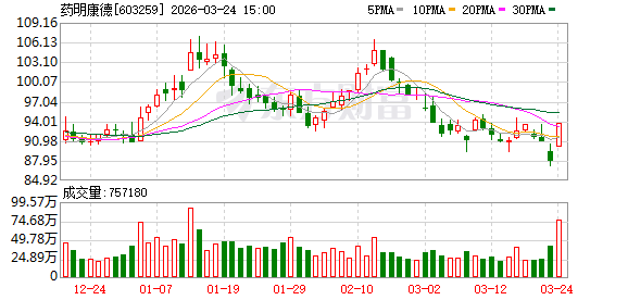 截至3月23日收盘,药明康德A股报87.79元/股,跌3.42%,市值2619.4亿元;港股报102.7港元/股,跌4.02%,市值3064.3亿港元。