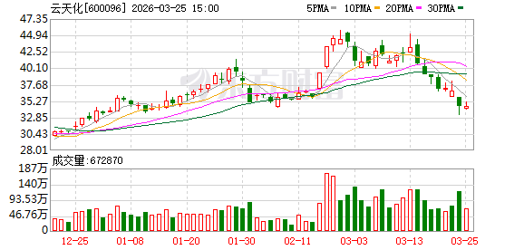截至3月24日收盘,云天化报34.51元/股,当日下跌5.94%,总市值629.11亿元。