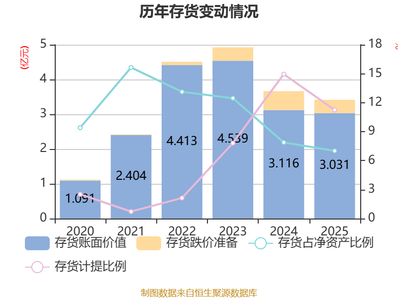 从存货变动来看,截至2025年末,公司存货账面价值为3.03亿元,占净资产的7.01%,较上年末减少848万元。其中,存货跌价准备为3840.84万元,计提比例为11.25%。