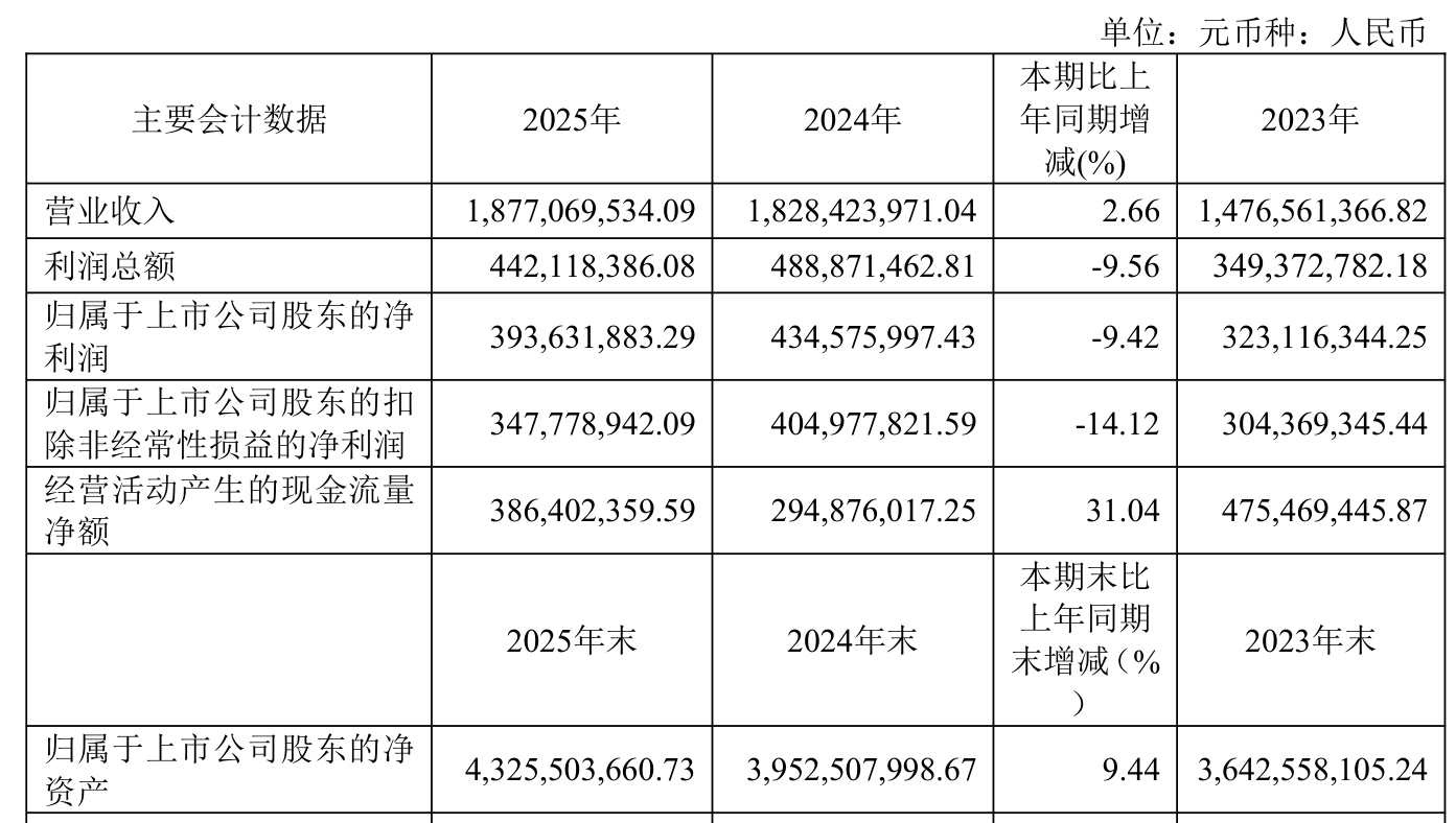 中证智能财讯新洁能(605111)3月27日披露2025年年度报告。2025年,公司实现营业总收入18.77亿元,同比增长2.66%;归母净利润3.94亿元,同比下降9.42%;扣非净利润3.48亿元,同比下降14.12%;经营活动产生的现金流量净额为3.86亿元,同比增长31.04%;报告期内,新洁能基本每股收益为0.95元,加权平均净资产收益率为9.52%。公司2025年度分配预案为:拟向全体股东每10股派现1.91元(含税)。