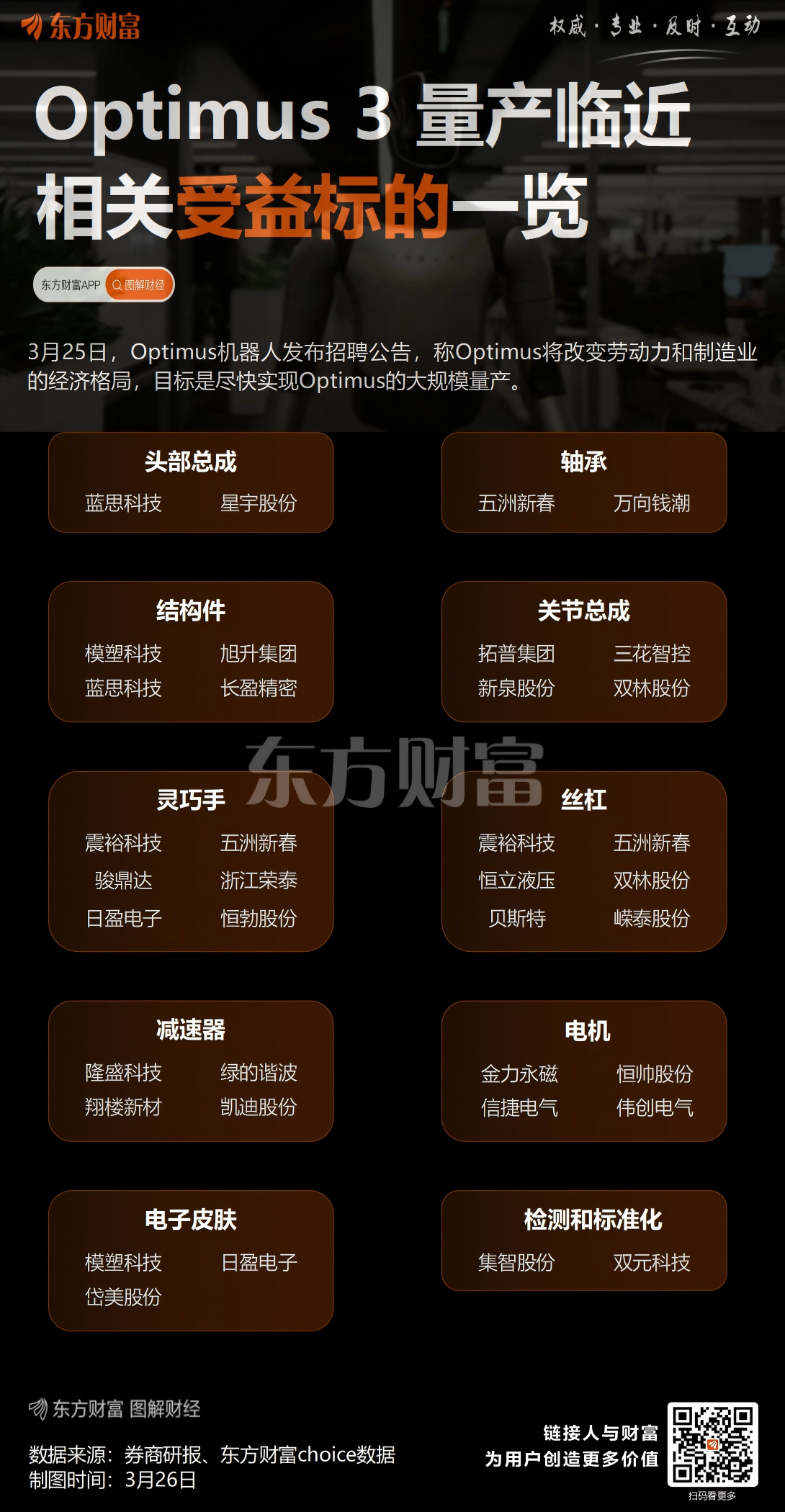 在中信建投看来,Optimus 3发布节奏等整体符合预期,产品量产规划明确。特斯拉正引领全球“物理AI”产业变革,人形机器人作为其核心支柱之一,持续进行“数据-算法-硬件”闭环迭代。产品也有望逐步从B端向C端延伸,逐步打开人形百万台预期空间,建议聚焦优质环节,把握确定性和灵巧手等核心变化。