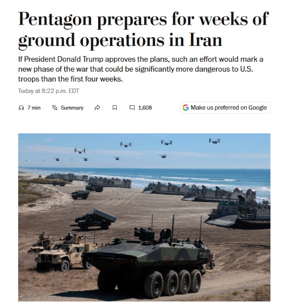 《华盛顿邮报》28日报道,五角大楼正筹备为期数周的有限地面行动,而非全面占领式入侵。目前已有数千名海军陆战队员、第82空降师伞兵进驻中东,其中第31海军陆战队远征队约3500人搭乘“的黎波里”号两栖攻击舰,直抵波斯湾核心海域。《华尔街日报》26日披露,美军正考虑增派至多1万人地面作战部队,涵盖步兵与装甲力量,总兵力规模仅为伊拉克战争的百分之一,彻底摒弃了当年百万大军压境的作战模式。