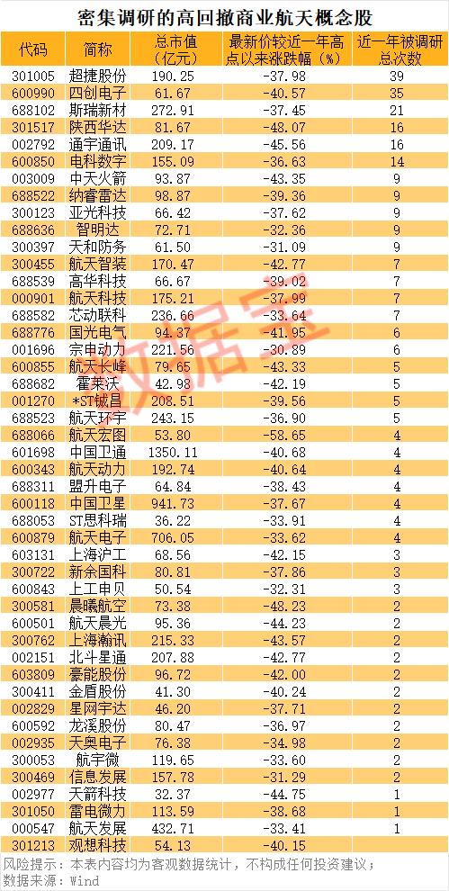 高回撤股中,超捷股份近一年被调研达39次。在近期的调研中公司表示,商业航天业务领域广阔,目前业务主要为商业火箭箭体结构件制造,包括箭体大部段(壳段)、整流罩等。此外,四创电子、斯瑞新材等个股获调研次数较多。