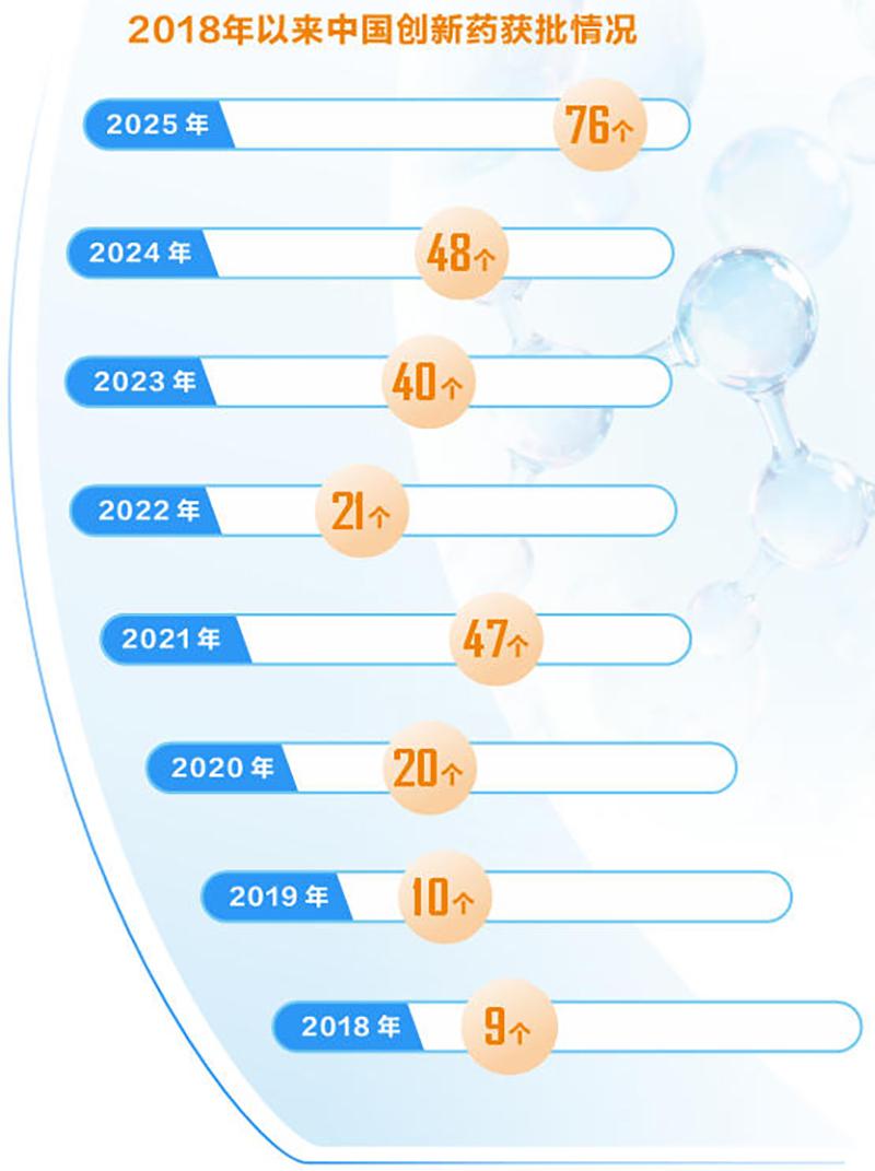 国家药监局数据显示,2025年国内获批创新药76个,再创历史新高;化学药品、生物制品领域国产创新药占比分别达80.85%、91.3%,本土创新已成主力。
