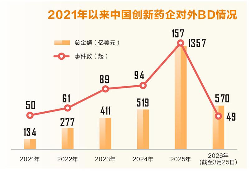 与此同时,我国创新药商务拓展(BD)对外授权交易同样刷新纪录。根据医药魔方数据,2025年,中国创新药BD出海授权全年交易总金额达到1356.55亿美元,交易总数量达到157起。2026年以来(截至3月25日),中国创新药已有49起对外BD事件,总金额近570亿美元,发展势头强劲。