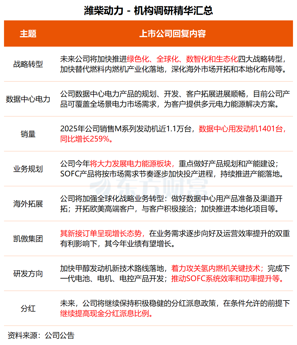 关于今年的增长点,潍柴动力称,预计2026年重卡行业规模在120万辆左右,公司将全力实现核心市场占有率、高端产品贡献率、整体盈利能力的稳步提升;加快数据中心产品推广,聚焦细分市场打造差异化产品组合,持续推进燃油发电产品升级与燃气发电产品市场推广等。
