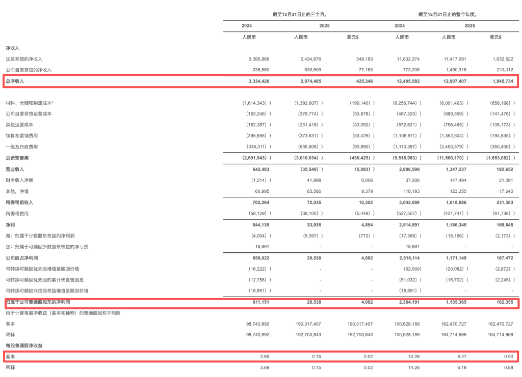 3月31日晚间,霸王茶姬(NASDAQ:CHA)公布了2025年第四季度及全年业绩数据。2025年全年,净收入同比增长4%至129.07亿元。营业利润为13.47亿元,据计算同比降53.33%。全年归母净利润为11.35亿元,据计算同比下滑52.4%。非GAAP净利润为19.1亿元,据计算同比降超两成。每股普通股基本收益为6.27元,据计算同比下降56%。