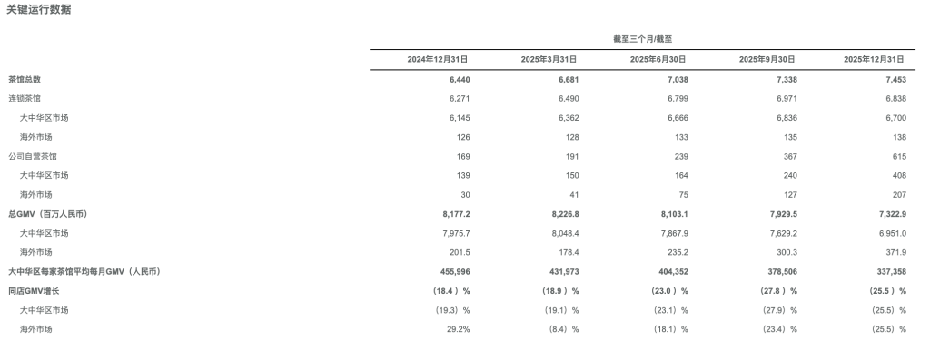 财报显示,去年全年,霸王茶姬GMV(总交易额)为315.8亿元,同比增长7.2%。去年第四季度,GMV为73.23亿元,据计算同比下降超一成。同店GMV增速为-25.5%,上年同期为-18.4%。从地域上看,大中华区市场GMV为69.51亿元,据计算同比下滑超一成。大中华区每家茶馆的平均月交易额为33.74万元,据计算同比下滑26%。