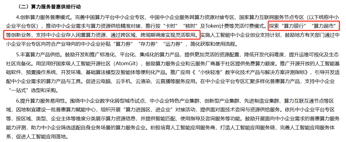 其中,算力服务普惠供给是此次专项行动的重点内容。工信部首次明确提出,探索“算力银行”“算力超市”等创新业务,支持中小企业存入闲置算力资源,通过跨区域、跨周期调度实现灵活取用。