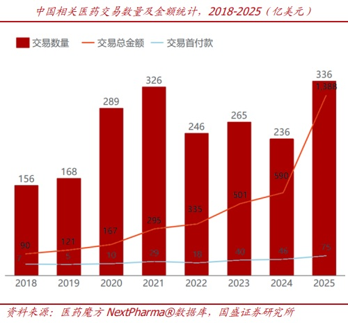 而过去的2025年,我国创新药BD交易总金额提升至1388亿美元(+135%),首付款增至75亿美元(+63%);2025年中国相关交易总金额约占全球交易总金额50%。