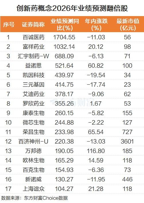 从机构预测的2026年业绩增速来看,百诚医药暂居首位,预计2026年业绩同比增长1704.55%。富祥药业紧随其后,预计业绩增幅为1032.14%。汇宇制药、益诺思、凯因科技、三元基因等业绩增幅也靠前。整体而言,创新药板块有17股预计2026年业绩翻倍。