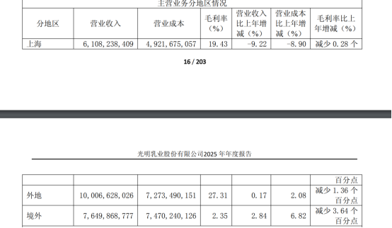 更令人担忧的是地域数据的表现。长期以来,上海及华东地区作为光明乳业的“现金牛”和“大本营”,一直被视为其抵御全国性品牌进攻的“护城河”。然而,2025年光明乳业在上海市场的营收仅为61.08亿元,同比大幅下滑9.22%。这一跌幅远超公司整体平均水平,也远高于外地市场(0.17%的微增)和境外市场(2.84%的增幅)。