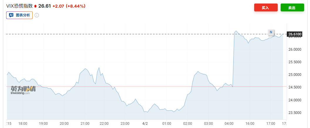 4月2日,VIX恐慌指数上涨至26.61点,涨幅超过8%。