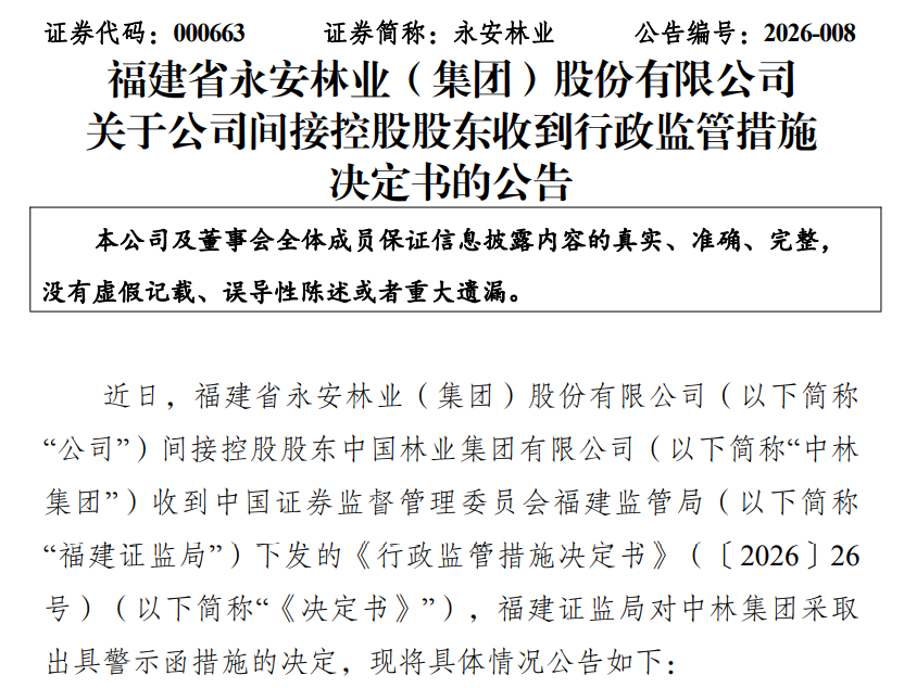永安林业表示,公司间接控股股东中林集团已向公司出具《关于延长避免同业竞争承诺履行期限的函》以及《关于延期履行承诺期间避免同业竞争措施及说明的函》,并经公司第十届董事会第二十五次会议、2026年第一次临时股东会审议通过。本次收到行政监管措施,不会导致公司控股股东、实际控制人发生变化,不会对公司治理、日常经营管理产生不利影响。公司将持续关注相关事项的进展情况,并按照相关法律法规、监管规则的规定及时履行信息披露义务。敬请广大投资者注意投资风险。
