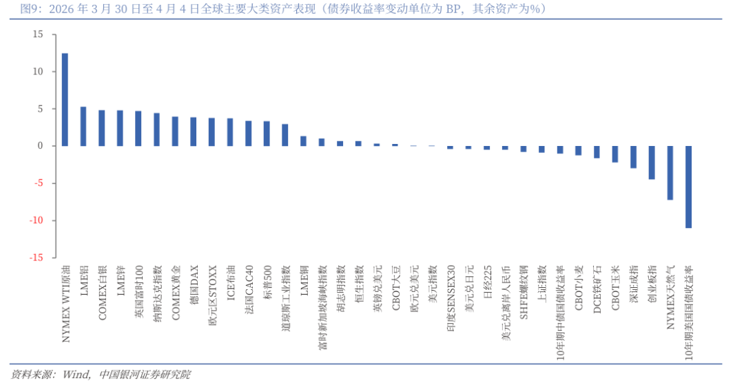 本周全球市场波动的核心驱动仍来自中东地缘冲突与能源冲击。伊朗战事持续胶着、霍尔木兹海峡通行受扰,市场对全球原油供给中断的担忧,推动WTI原油价格创新高,同时也推升潜在通胀预期。这一背景下,贵金属与部分工业金属同步走强。与此同时,能源冲击叠加通胀不确定性,使主要央行对政策转向保持谨慎,美联储官员普遍释放维持利率不变的信号,但美债收益率整体下行。权益市场方面,美国非农就业明显好于预期、科技产业资本运作活跃对市场情绪形成支撑,使欧美股市在周中震荡后实现反弹。