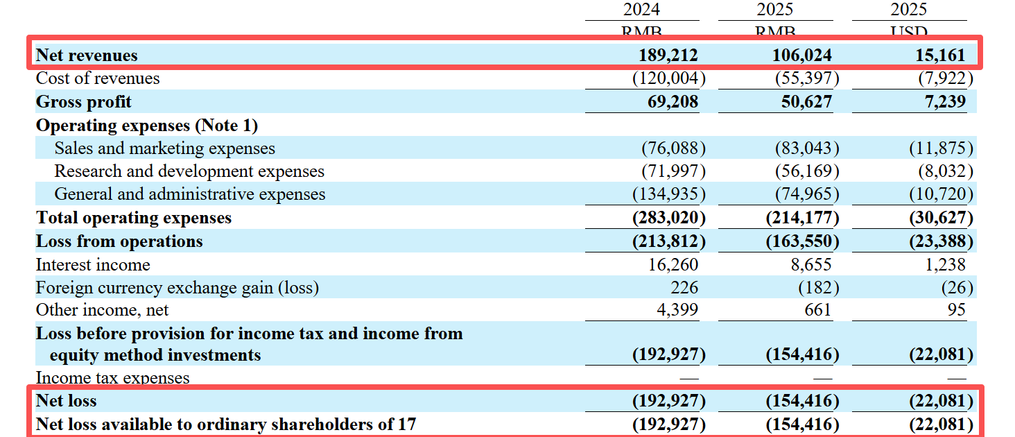 日前,一起教育科技(NASDAQ:YQ)发布2025年年度报告,公司全年实现营收1.06亿元,较上年同期的1.89亿元“断崖式”下跌44%;尽管净亏损从1.93亿元收窄至1.54亿元,但全年血亏的残酷现实加上账上4.07亿元现金,能否支撑到盈利彼岸。