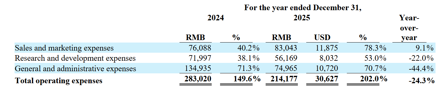 2025年,总营业费用2.14亿元,较2024年的2.83亿元同比下降24.3%。其中,公司研发费用为5620万元,同比下降22%,此次降级主要源于基于股份的薪酬减少以及研发人员和相关成本持续提升的效率。
