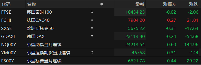 周二盘前,美股三大股指期货齐跌,欧洲主要指数多数下跌。截至发稿,纳斯达克100指数期货跌0.60%,道指期货跌0.31%,标普500指数期货跌0.44%。