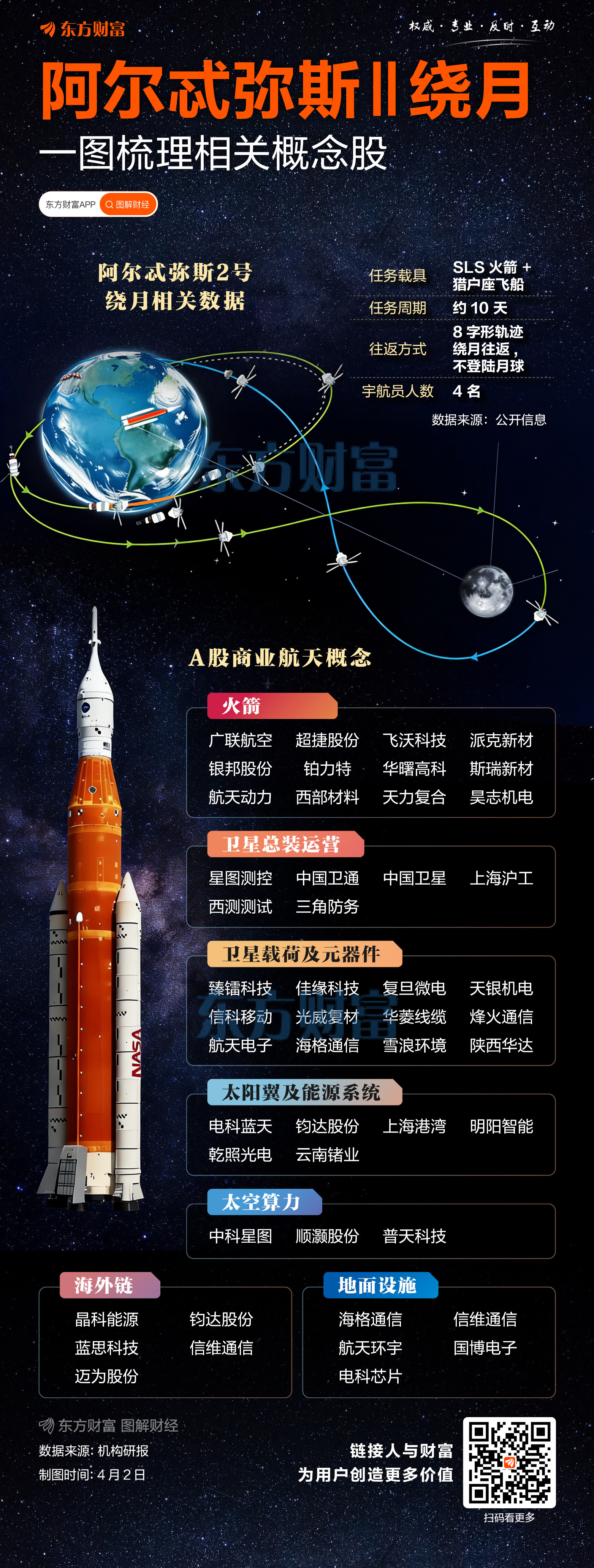 此次“阿耳忒弥斯2号”任务使用美国新一代登月火箭“太空发射系统”和“猎户座”飞船,搭载4名宇航员,包括3名美国宇航员和1名加拿大宇航员。“太空发射系统”于4月1日晚从佛罗里达州肯尼迪航天中心发射升空。