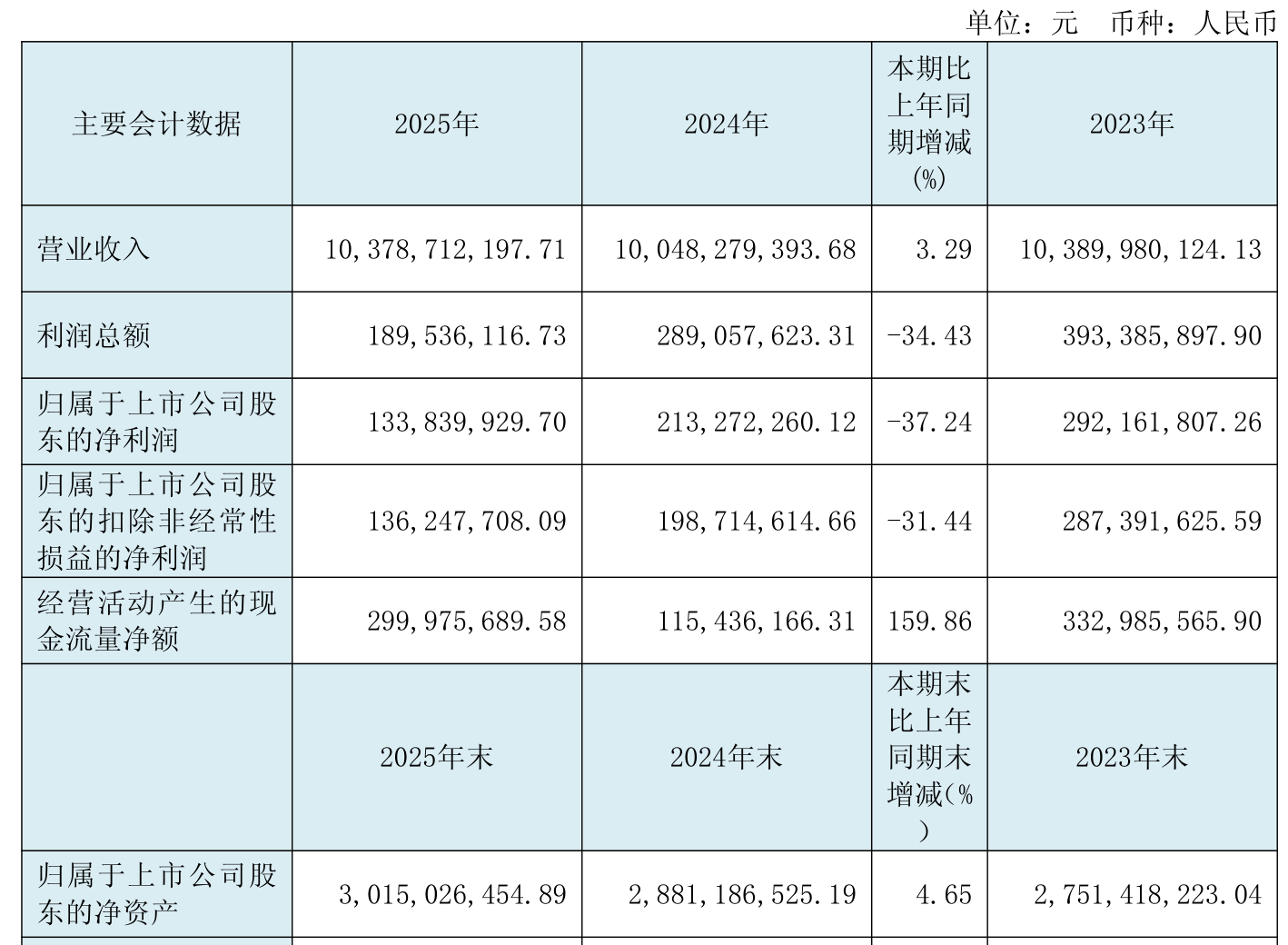 中证智能财讯人民同泰(600829)4月11日披露2025年年度报告。2025年,公司实现营业总收入103.79亿元,同比增长3.29%;归母净利润1.34亿元,同比下降37.24%;扣非净利润1.36亿元,同比下降31.44%;经营活动产生的现金流量净额为3亿元,同比增长159.86%;报告期内,人民同泰基本每股收益为0.2308元,加权平均净资产收益率为4.54%。