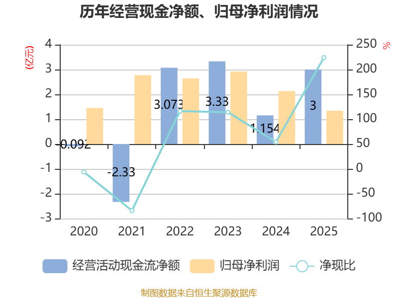 截至2025年,公司经营活动现金流净额为3亿元,同比增长159.86%;筹资活动现金流净额-1.13亿元,同比增加2.12亿元;投资活动现金流净额-1702.28万元,上年同期为-789.48万元。