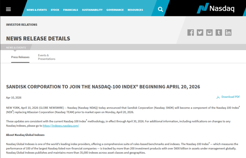 美国当地时间4月10日,纳斯达克宣布,闪迪公司将于2026年4月20日(周一)开盘前,正式成为纳斯达克100指数成份股,取代软件即服务(SaaS)巨头Atlassian公司。