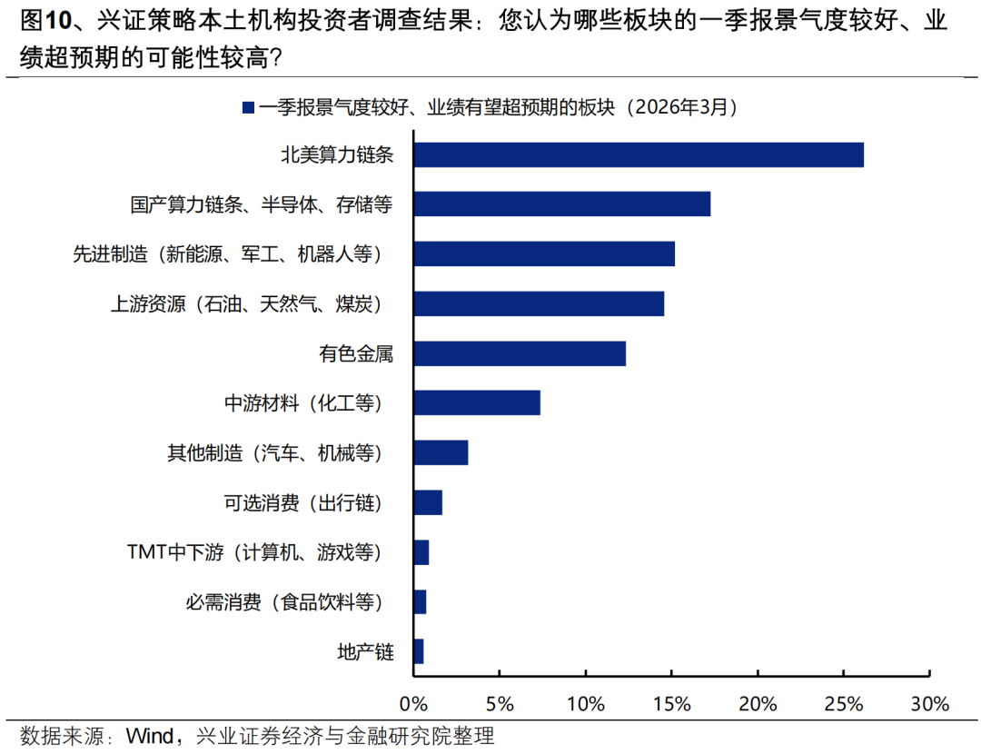 根据我们3月23日至25日针对260+位本土核心投资机构的基金经理、投研负责人与总量研究员的调查结果,当前机构投资者对算力链、先进制造与上游资源一季报景气共识较强。当前机构投资者对一季报业绩共识最强的高景气方向是北美算力链条(26%),其次为国产算力链条、半导体、存储等(17%)、先进制造(新能源、军工、机器人等)(15%)、上游资源(石油、天然气、煤炭)(15%)和有色金属(12%)。
